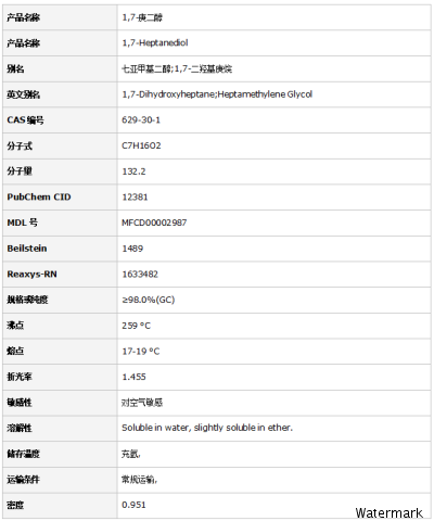 1,7-庚二醇 巴豆醇 巴豆基溴 二氢呋喃 十四烷二酸 正庚醛 溴癸烷 溴代异丁烷 L,22-二十二烷二醇 1,18-十八烷二醇 1,17-十七烷二醇 1,16-十六烷二醇 1,15-十五烷二醇 1,14-十四烷二醇 1,13-十三烷二醇 1,11-十一烷二醇 1,7-庚二醇